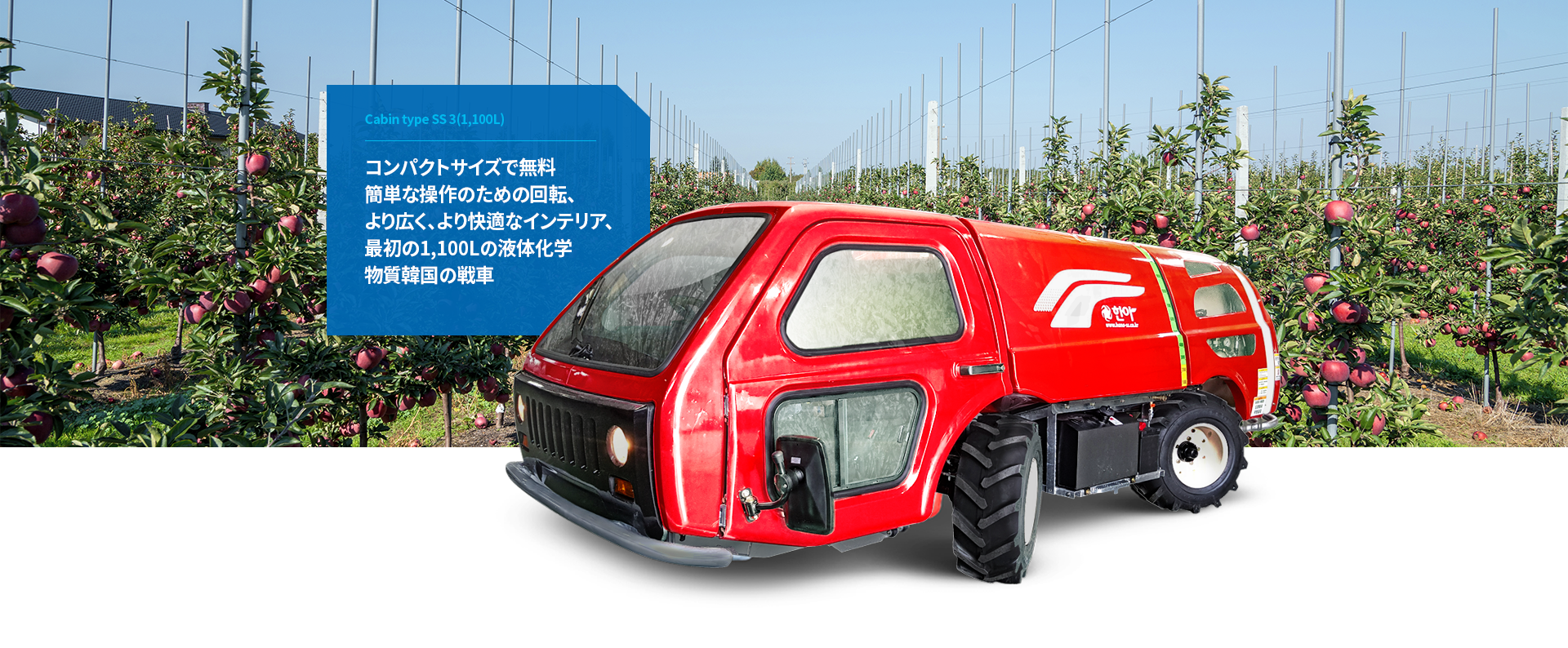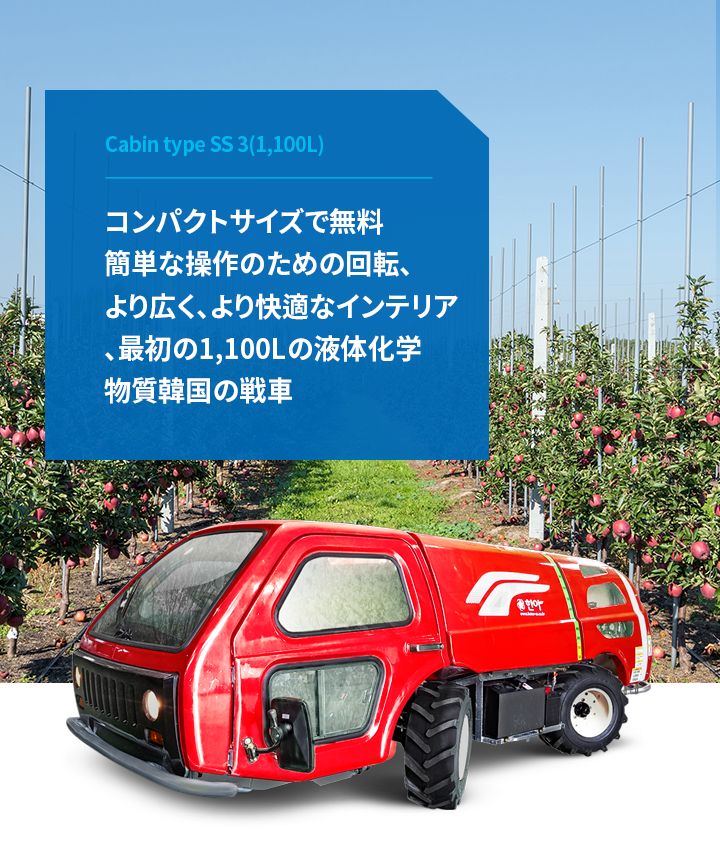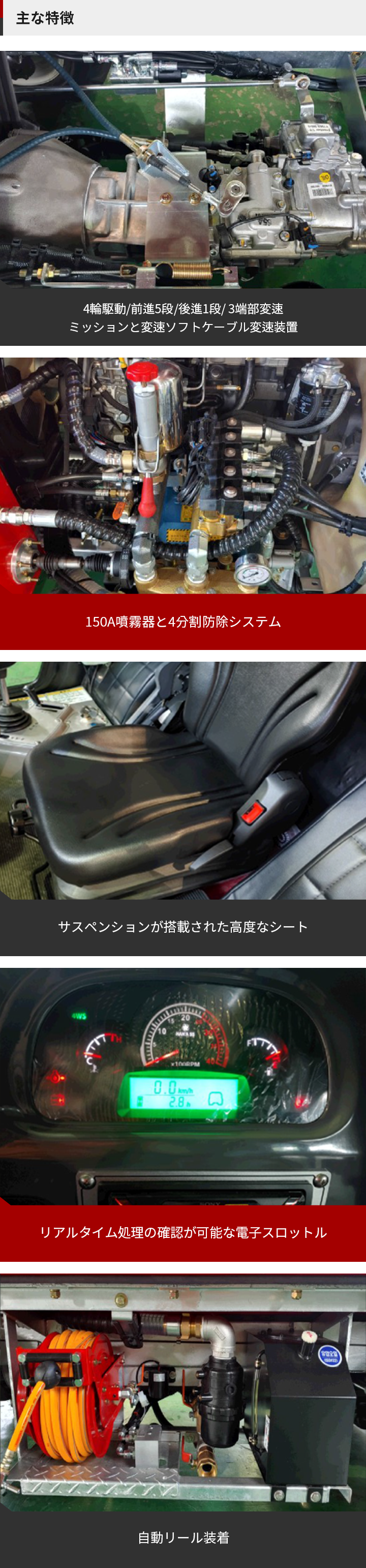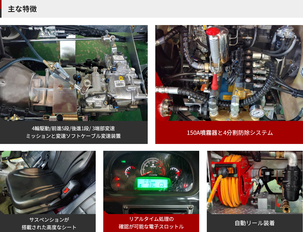 - 65馬力のターボエンジンの強力なパワーと国内初1100L薬液タンク4分割防除